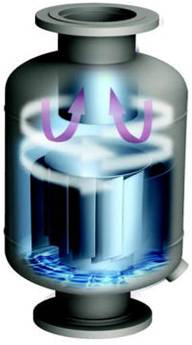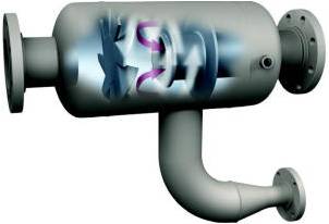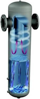 Moisture laden gas enters the TS style separator and is deflected downwards in a centrifugal motion. The reduction in velocity separates out the liquid, which falls below and coalesces under the patented Vortex Containment Plate (VCP). The VCP prevents reentrainment of the liquid into the gas. The resulting dry, clean gas flows upwards and exits through the outlet of the separator. Wright Austin accomplished this without complex baffles, deflectors and other structures that obstruct the flow-stream and this results in very low pressure drops.